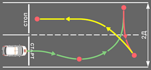 Занимаем исходную позицию у отметки "СТАРТ", включаем I передачу и проезжаем к фишке "А" так, чтобы переднее левое крыло автомобиля было с ней на одном уровне. Продолжая медленное движение, интенсивно вращаем руль вправо до упора и доезжаем как можно ближе к фишке "Б", останавливаемся у нее, вращаем руль влево. Включаем заднюю передачу и контролируя по зеркалам или повернувшись назад двигаемся задним ходом до линии, соединяющей фишки “А” и "В", останавливаемся у нее. Вращаем руль вправо, вновь включаем I передачу и доезжаем до отметки "СТОП". Выключаем сцепление, выключаем передачу (ставим в нейтральное положение), ставим на стояночный тормоз. Убираем ноги с педалей.