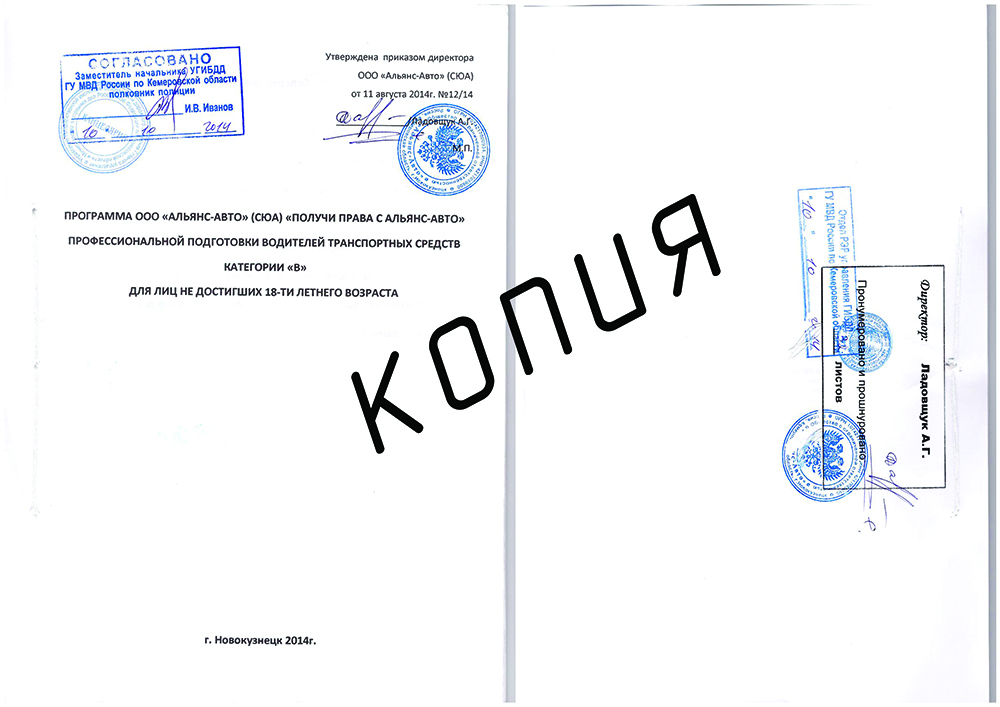 Программа обучения лиц, не достигших 18-ти летнего возраста, по которой мы работаем, согласована с УГИБДД ГУ МВД России по Кемеровской области, о чем свидетельствуют соответствующие документы: